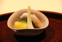 最初の一品は小さなお椀。ショウガの良い香りのするお出汁にアマダイ、玉ねぎ、おもちが入っています。ほんのり温まる一品。