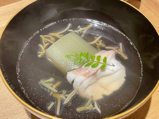 続いては冷たい一品。たこのトマトジュレ。たこは吸盤とそれ以外に分けて別々に調理したもの。吸盤部分は長めに茹でているそう。コリコリです。お肉の部分は鱧のように美しく包丁が入っています。
