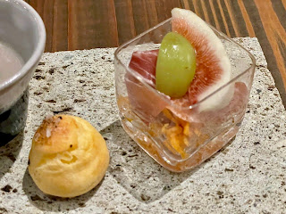 アミューズは、きのこのスープ、チーズの香り豊かなグジェール、人参のラぺの上にいちじく、生ハムとシャインマスカットが盛られた一皿。